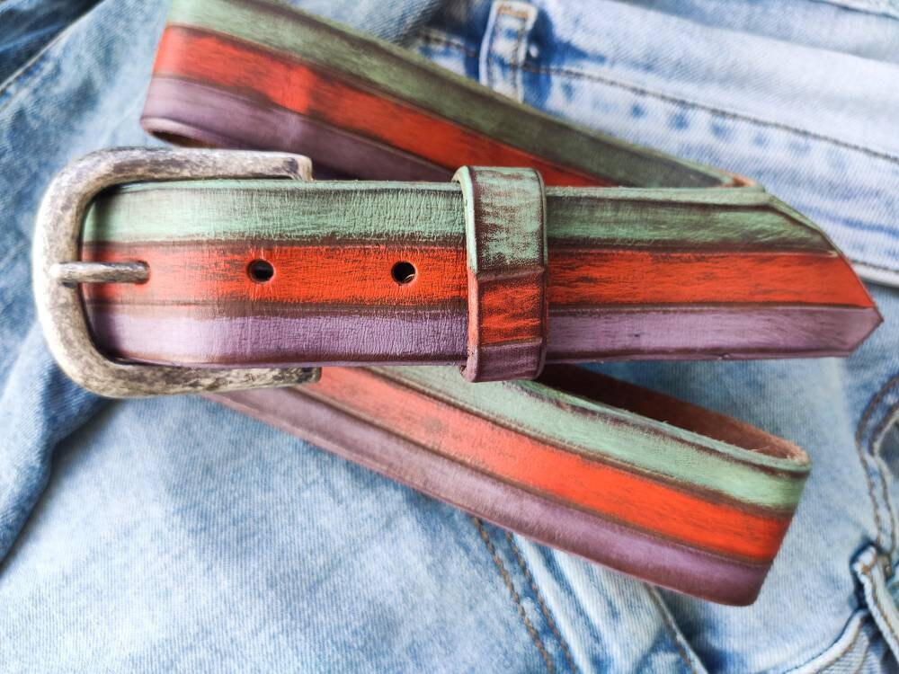 * A turquoise orange and purple leather belt with brown wash and metal buckle.