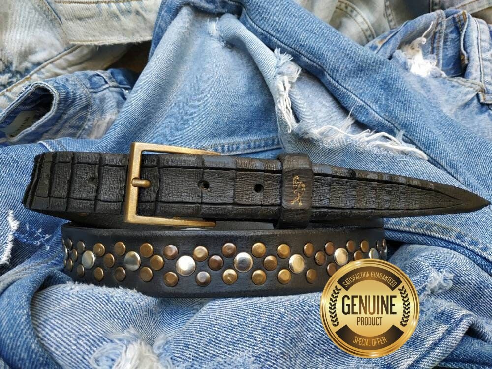 Made from premium full grain leather.Only the tail of the belt is crafted in a reptile kind of look. All the cuts are carefully made by hand with razor sharp knives and after dyed in a black color. After the dying process, I finished the belt with wax to endure the color of this beautiful piece.