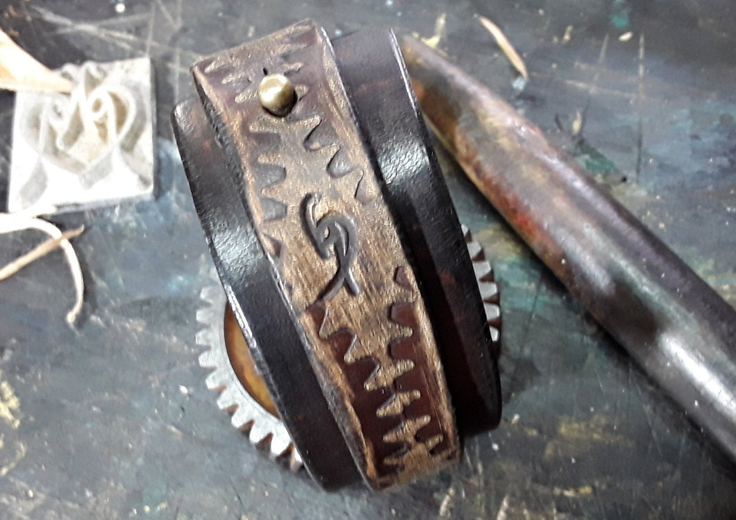 Made out of one piece of leather and cut in a triangular shape that wraps 1.5 times around the wrist.After the cutting and preparing are done, I embossed a gear of a motorcycle as a nice design in the tail of the cuff, that I got as a reminder of flat tire repair with my motorcycle.
