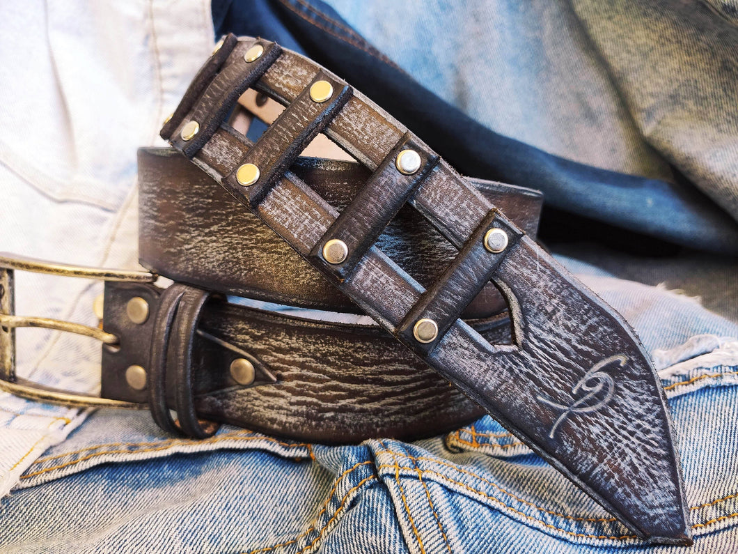 * A riveted brown leather belt with gray wash and golden studs and a metal buckle in an oxidized silver color.