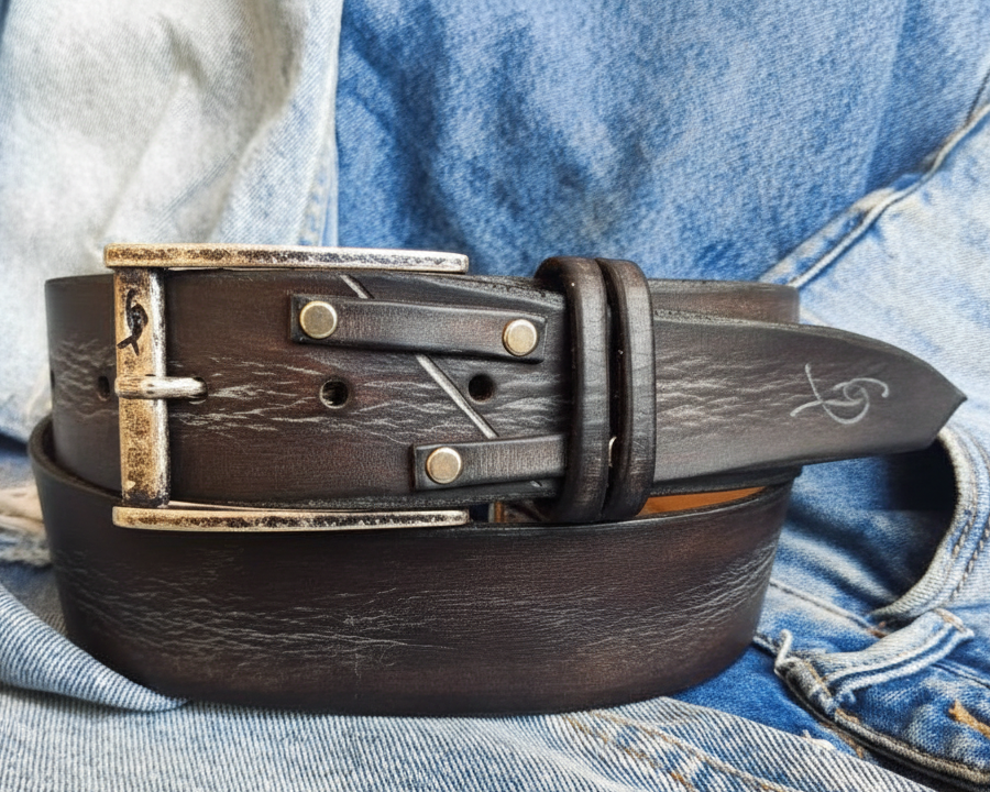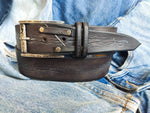 * A Dark brown with gray wash , riveted leather belt with a metal buckle.