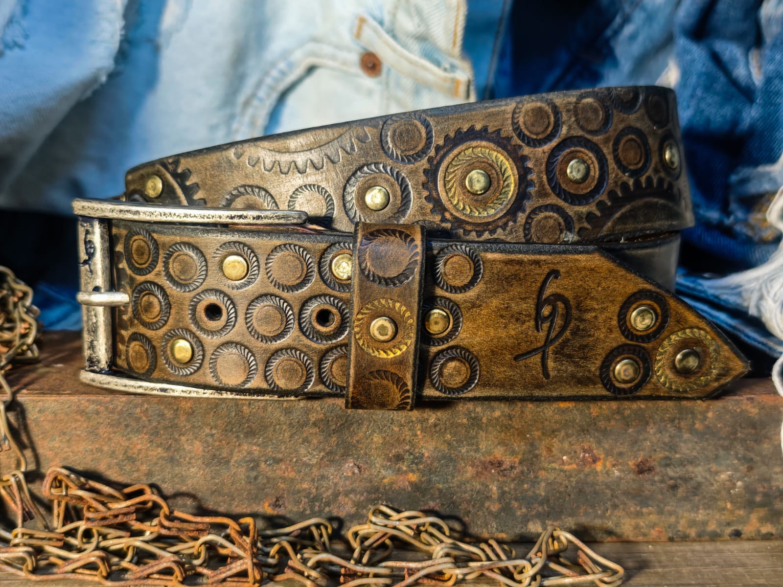 * A dark brown leather belt embossed with beautiful motorcycle gear design, vintage finish and rivets .