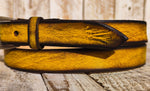 This stunning yellow leather belt with dark brown wash is handcrafted from top quality full grain leather. I choose each hide separately, after testing them for faults and thickness. The leather is then hand-colored to a rich turquoise hue with a brown wash for a unique and rustic look.