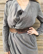 * A brown leather waist belt that has a unique decorative cord closure. The narrow part of the belt connect to the wider part of the belt with three bronze pins