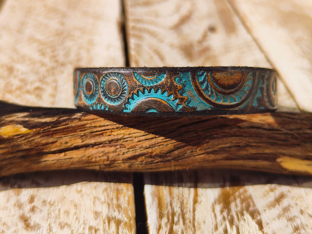 Step into the world of steampunk fashion with this meticulously handcrafted leather bracelet by Ishaor. Measuring 1.5 cm in width, this unique accessory features an intricate embossed design inspired by motorcycle gears, seamlessly blending industrial aesthetics with a touch of elegance. The rich brown leather is artfully accented with hints of turquoise, creating a striking contrast that enhances the detailed gear