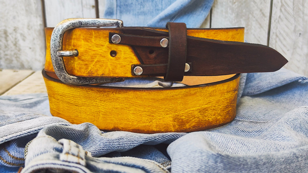 * A yellow with brown riveted leather belt with a metal buckle in an oxidized bronze color.