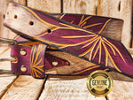 The enchanting purple flower engraving is meticulously carved into the smooth white leather, adding a touch of natural beauty and charm to the design. The black wash finish complements the floral motif, creating a stunning contrast that catches the eye and sets this belt apart from the rest.