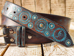 Handmade Leather Belt by Ishaor - Brown with Turquoise Motorcycle Gear Design