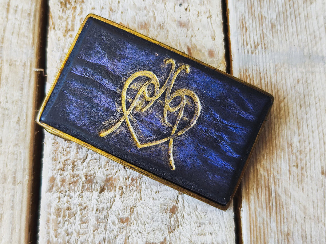 Make a statement with this one-of-a-kind purple leather belt buckle with a black wash and gold Ishaor double logo. This buckle is the perfect way to add a touch of luxury and sophistication to any outfit.