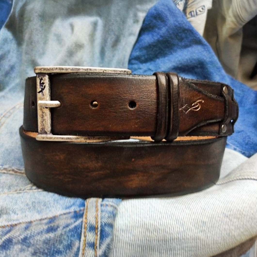 Dark brown handmade leather belt with unique working method and the special expression that we make with a secret formula, The leather receive unique textures that are embossed and create a unique item, every belt a little different.
