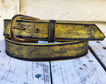 Embrace the extraordinary with this one-of-a-kind black leather belt, imbued with the soul of a craftsman's hand. The rich black leather boasts a stunning golden wash, shimmering like sunlight through desert sands. A unique textured finish adds depth and character, making this belt a statement piece unlike any other.