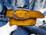 This handmade yellow leather belt is a stunning accessory that is sure to elevate any outfit. Measuring 4.2cm in width, it features a beautiful brown wash and a unique silver buckle design in the shape of a horseshoe, making it a truly one-of-a-kind piece.