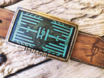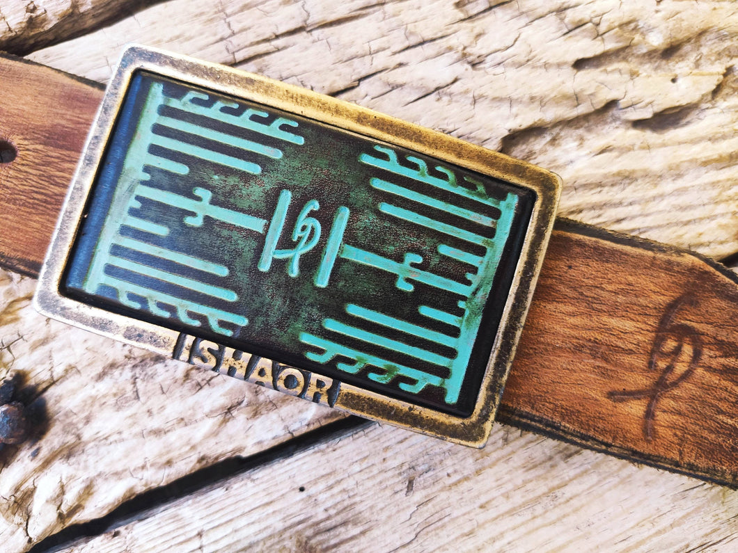 a Ishaor original square buckle with turquoise leather embossing with heat sink cooler & brown wash stunning buckle that upgrade any belt