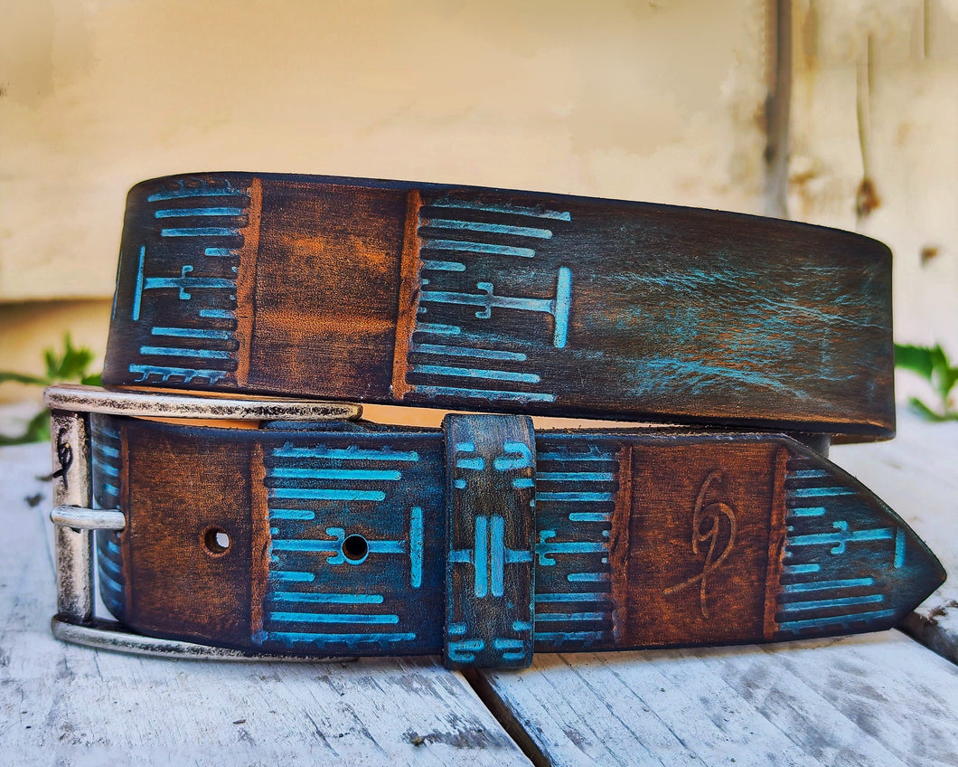 Discover the unique blend of art and craftsmanship with this Handmade Brown & Turquoise Leather Belt by Ishaor. Each belt is meticulously hand-stamped with a design inspired by the intricate patterns found in computer components, making it a standout accessory for tech enthusiasts and fashion-forward individuals alike.