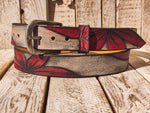 Handmade Leather Belt with Red Flower Carvings - Unique White Leather Belt with Black Wash and Lines - Custom Vintage Texture by ISHAOR