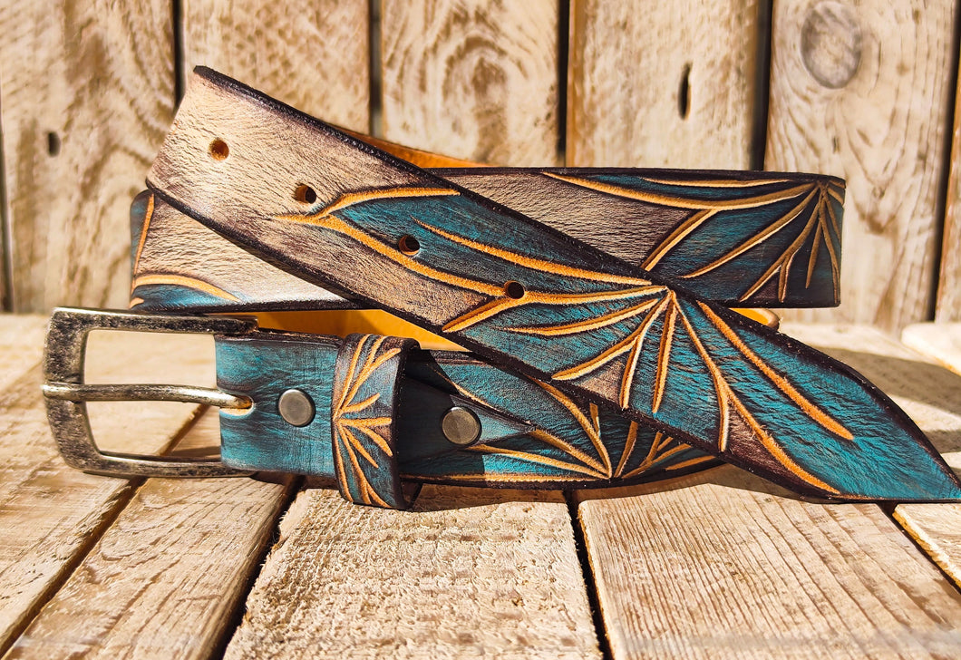 Discover the beauty of craftsmanship with this one-of-a-kind handmade leather belt, featuring intricate hand-carved flowers in a stunning turquoise hue. The white leather base contrasts beautifully with the delicate brown wash that highlights the floral design, creating a piece that is both elegant and unique.