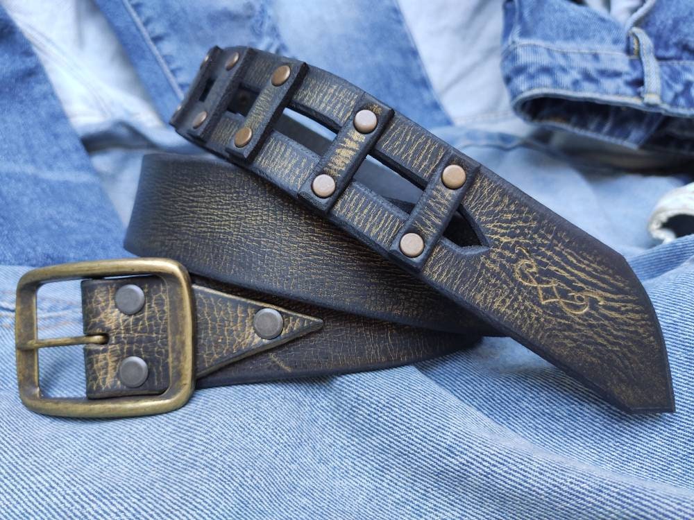 This unique, riveted belt is one of kind, and sure to get you noticed. Each part is made by hand, the pieces spaced one inch apart and the rivets are black with gold cover color on the outside and black on the inside. Meticulously crafted and carefully thought out, this original belt is one of the designs, I am most proud of. It represents the nature of this shop, which is a standout, original design. This belt will suit men and women.