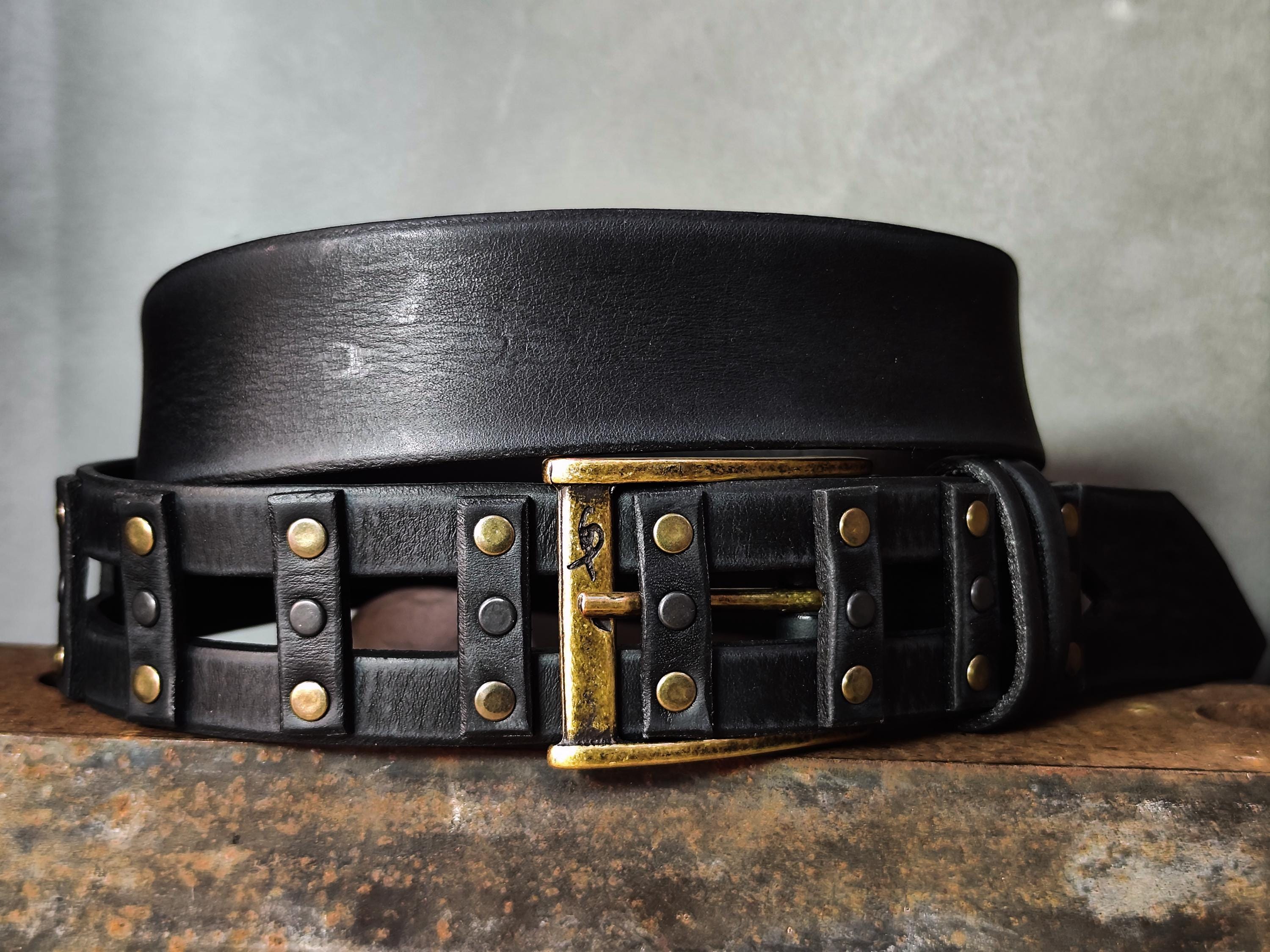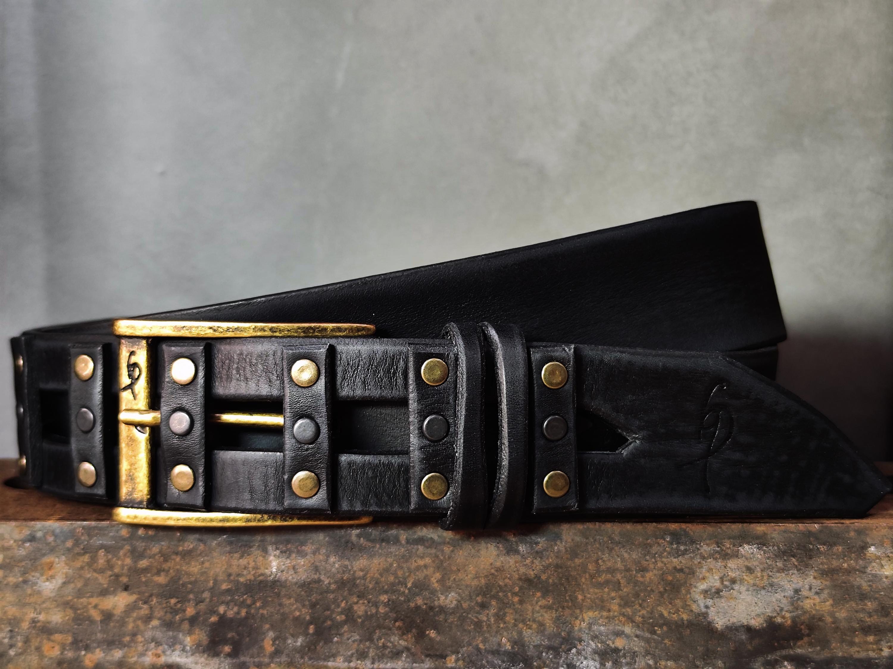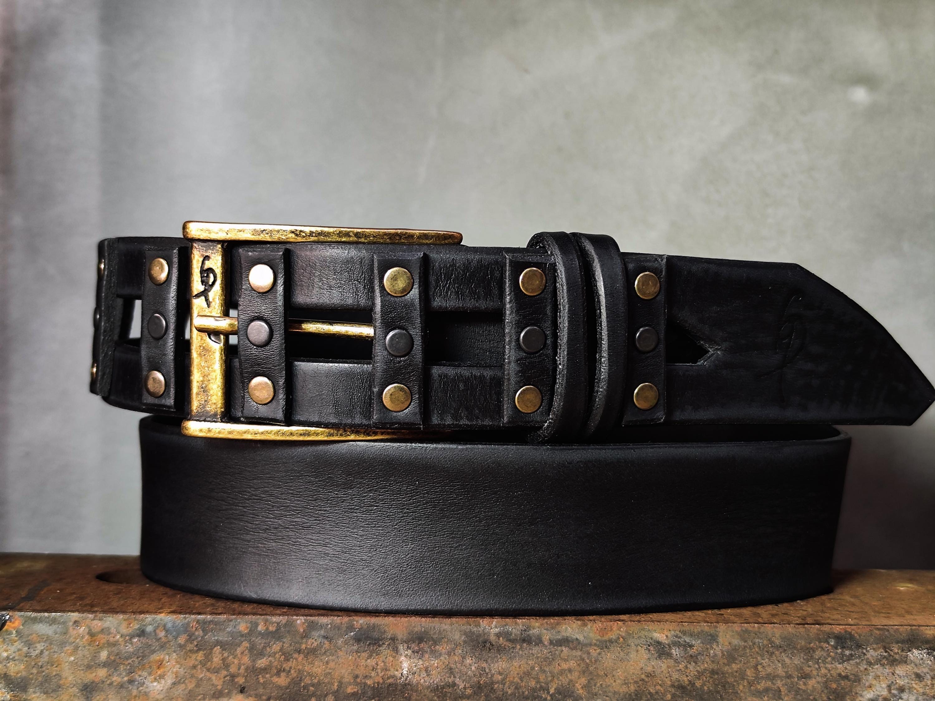 Each belt is hand-cut and carefully assembled in our studio using thick, full grain leather. The metal rivets are securely set and add a unique design element that gives the belt a slightly edgy, rock-inspired character while remaining clean and wearable.