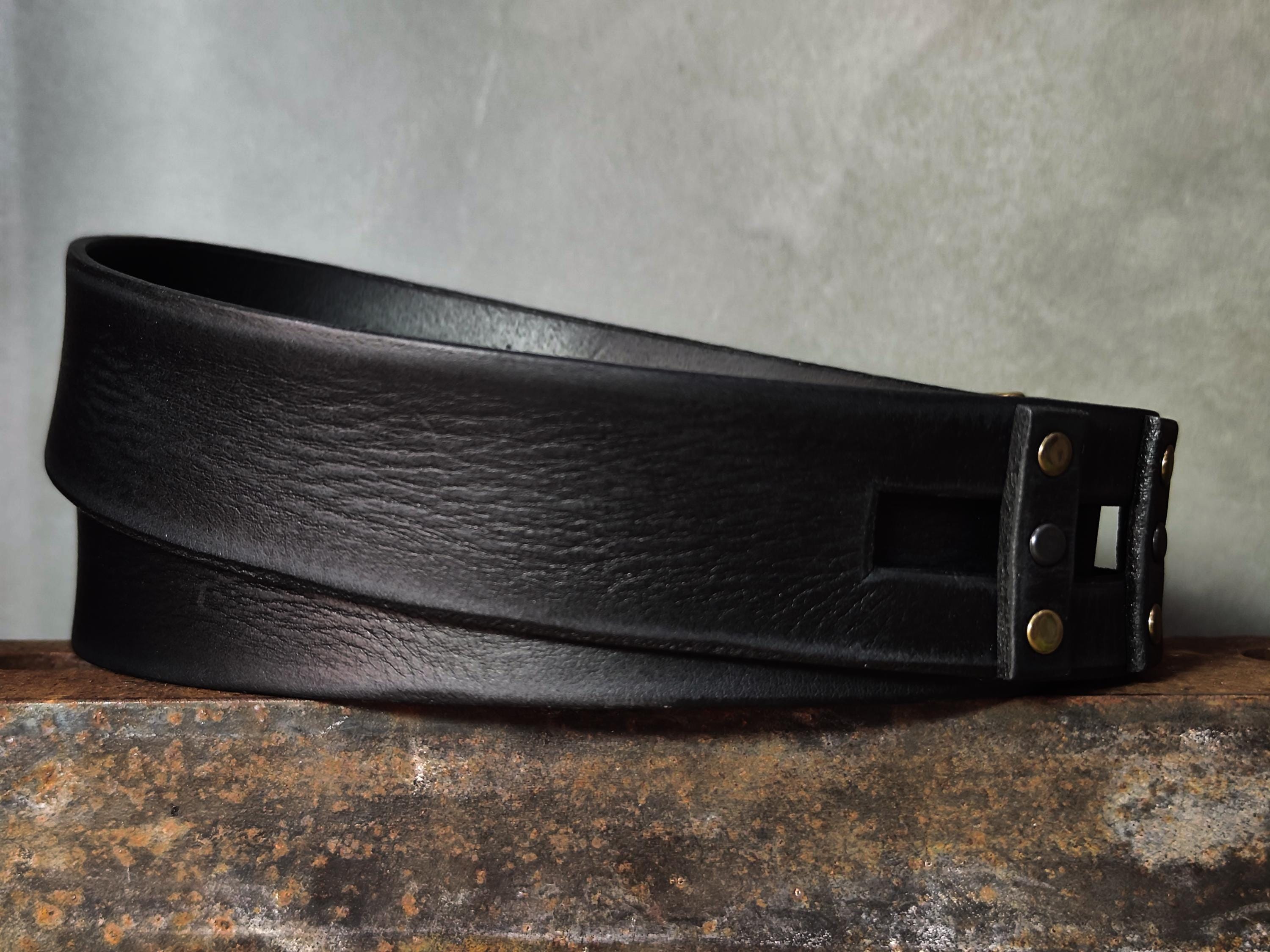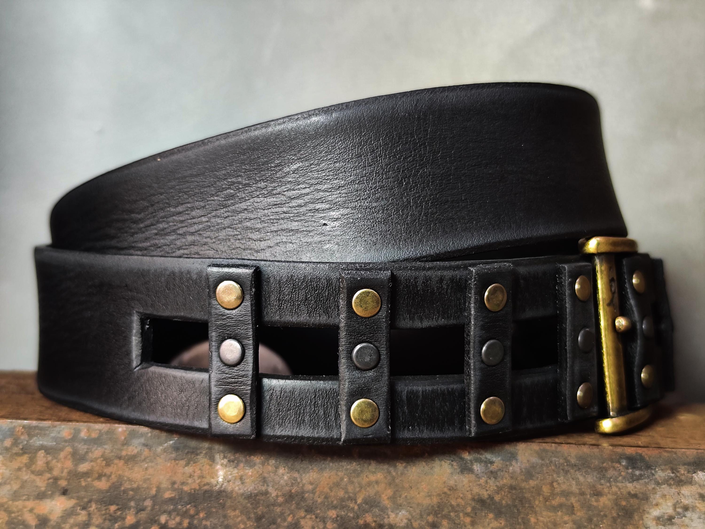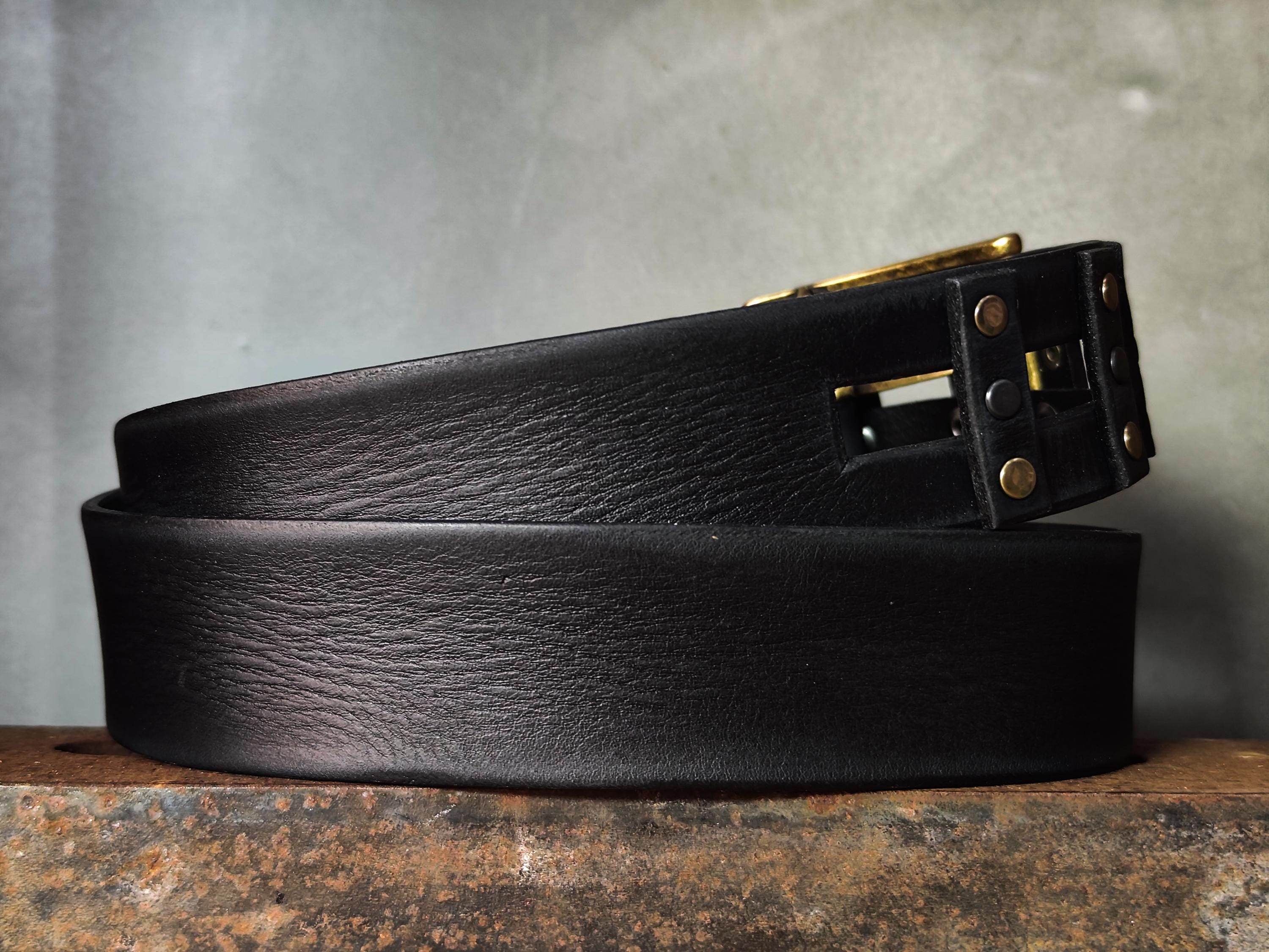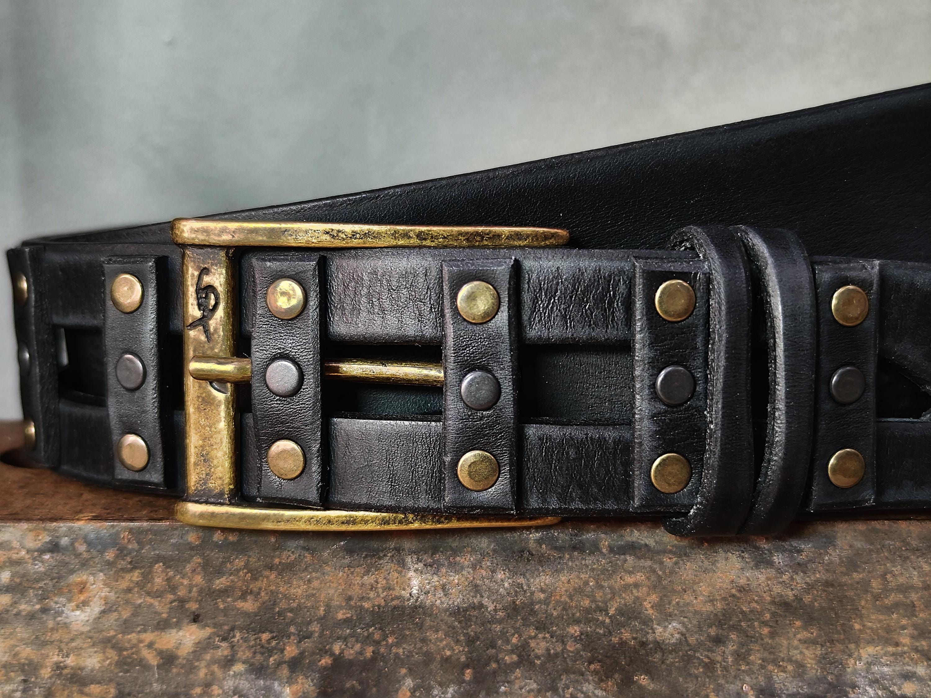Each belt is hand-cut and carefully assembled in our studio using thick, full grain leather. The metal rivets are securely set and add a unique design element that gives the belt a slightly edgy, rock-inspired character while remaining clean and wearable.