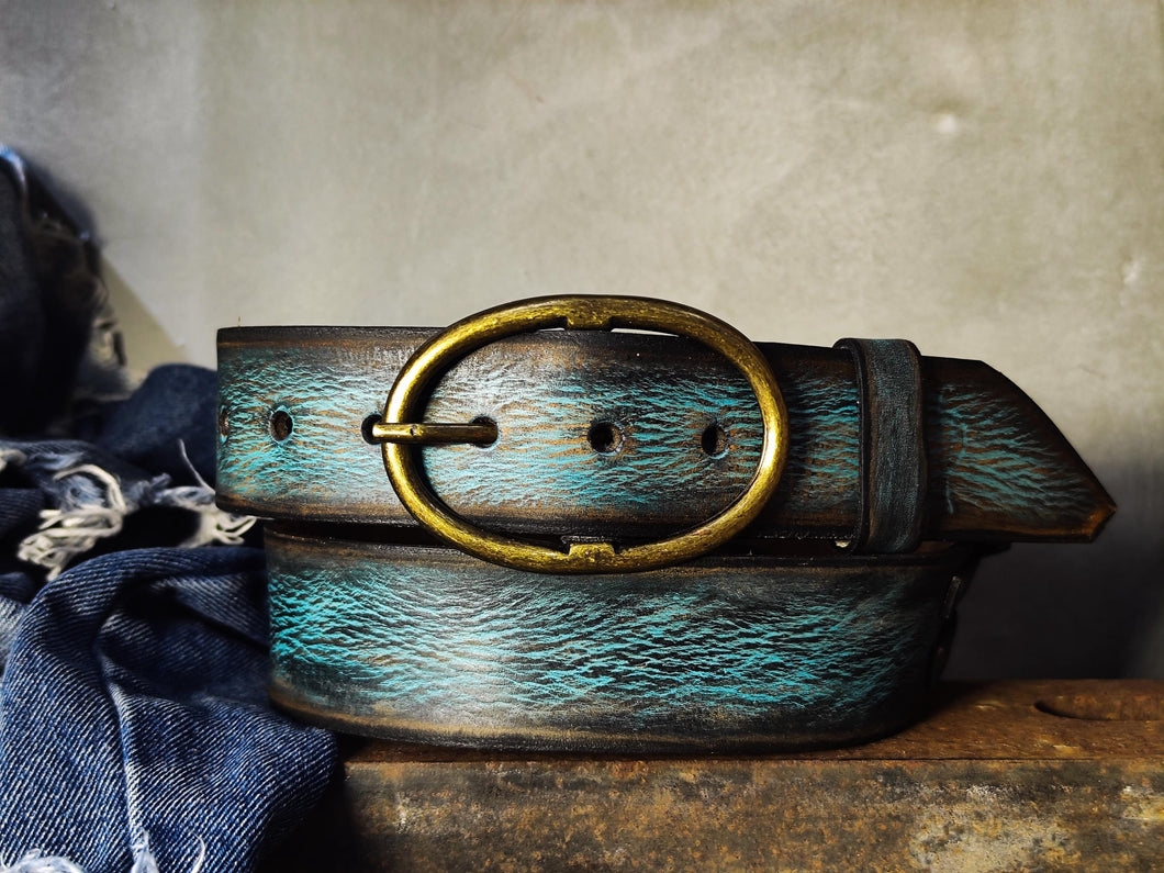 Elevate your denim game with a belt that tells a story. Handcrafted in our studio, this belt features a stunning, one-of-a-kind distressed turquoise finish that mimics the depth of the ocean and the character of vintage workwear.