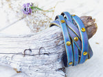 Indulge in the elegance of this stunning accessory, which showcases a harmonious blend of purple leather and a captivating turquoise wash. The touch of gold adds a luxurious touch, elevating the overall aesthetic to a whole new level. Each gold piece is carefully decorated, enhancing the bracelet's allure and making it truly one-of-a-kind.