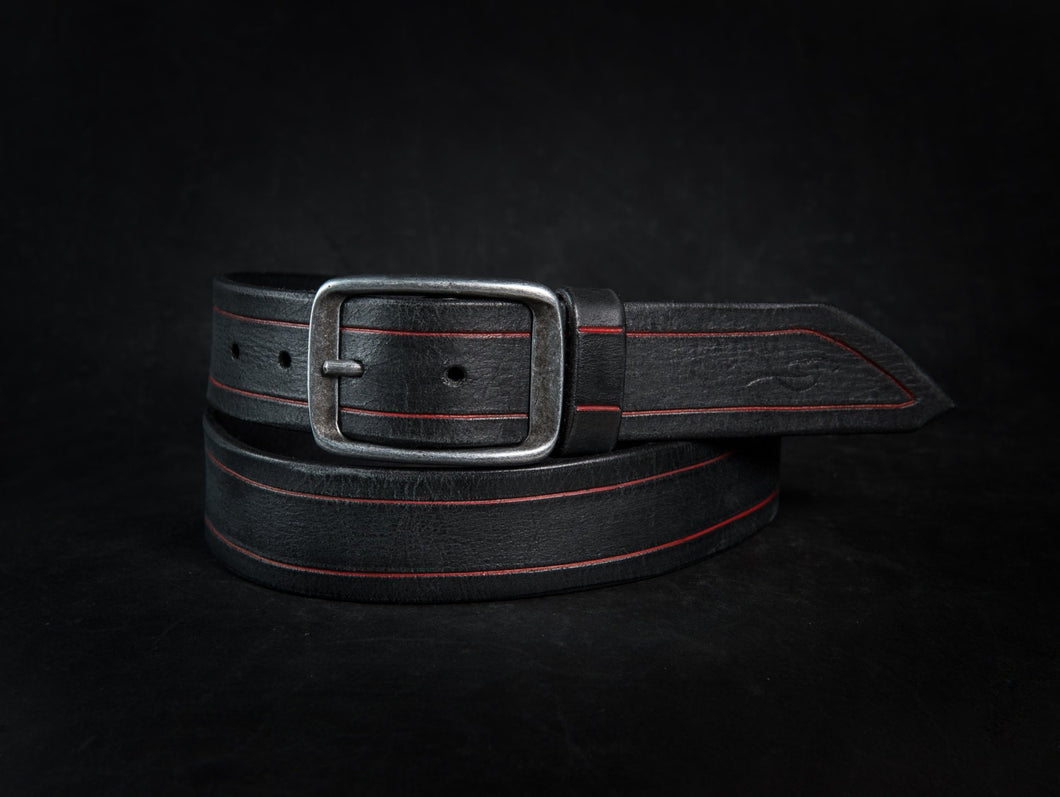 * A black leather belt engraved with a red line with gunmetal color buckle.
