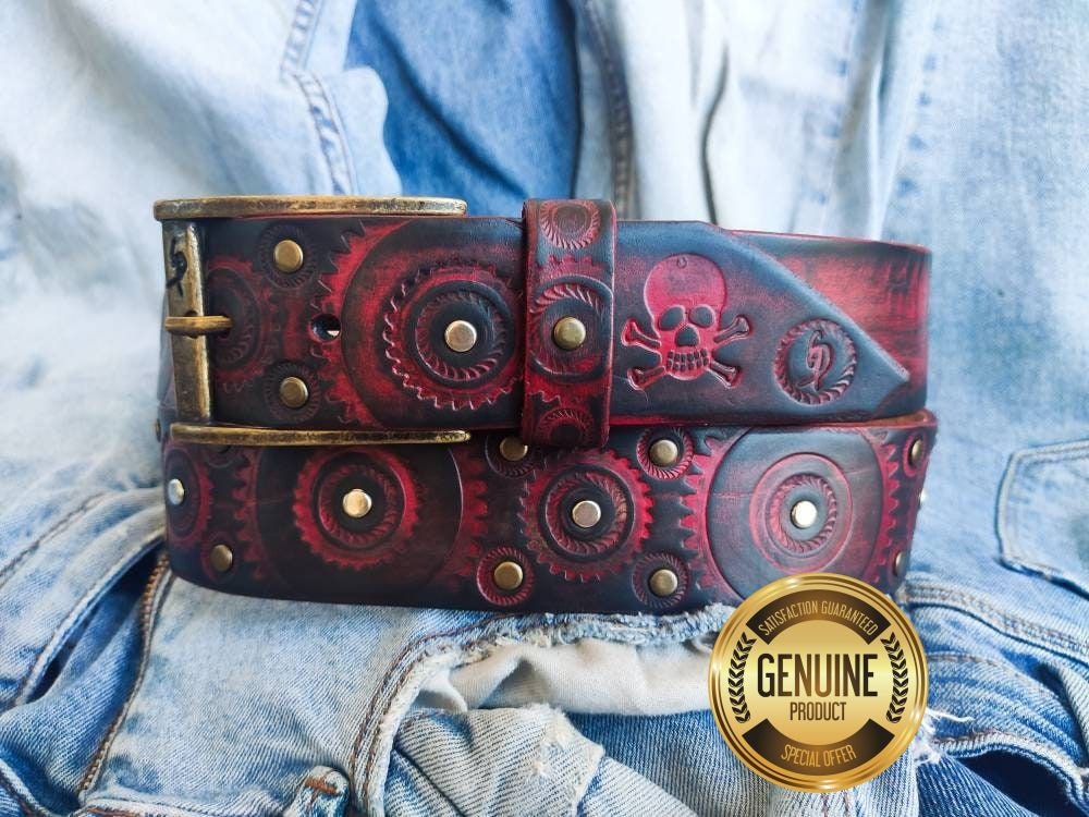 Red Leather Belt with Biker Style Unique Belt with Motorcycle Gear Stamps and Black Wash Accessories Gift for Bikers